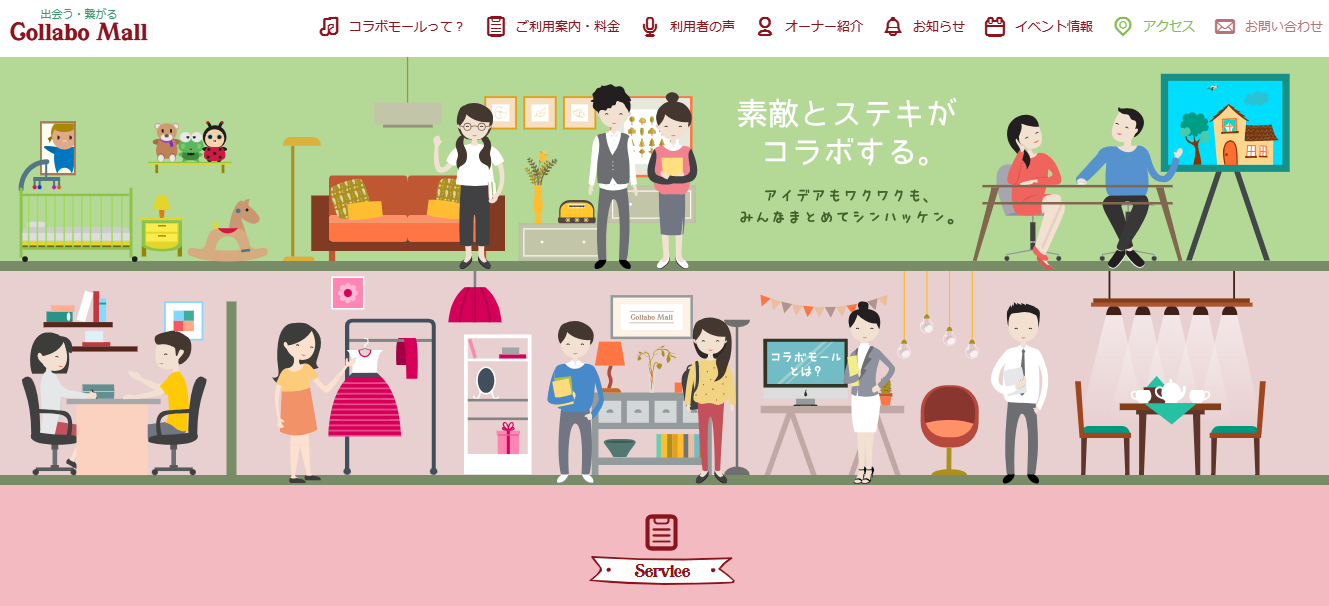 コラボモールは、建物内にシェアオフィス・サロン・スクール・カフェと多様な用途が混在する“複合型シェアテナント”です。